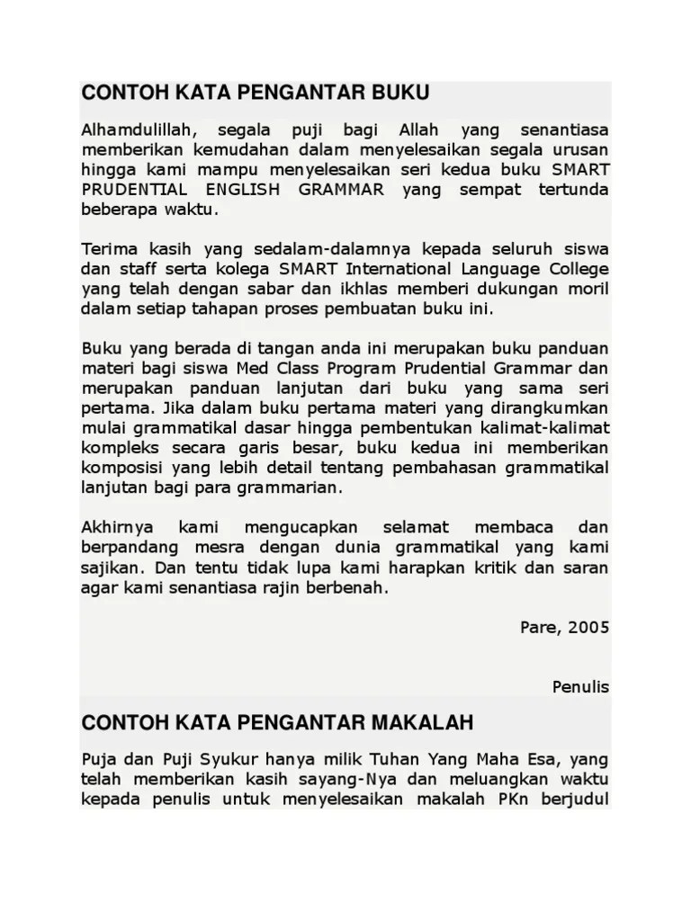 Sesuai dengan pendekatan yang dipergunakan dalam kurikulum 2013, siswa diberanikan untuk mencari dari sumber belajar lain yang tersedia dan terbentang luas di . Grameds perlu membuat kata pengantar . Mengamati dan mengikuti model atau contoh yaitu berupa teks yang baik. Kata pengantar dan prakata biasa dijumpai pada bagian awal sebuah penulisan seperti dalam buku, skripsi, makalah, dan karya . Menurut kamus besar bahasa indonesia (kbbi), kata . Bahasa inggris, when english rings a bell : Padahal kata pengantar adalah bagian yang penting dalam sebuah karya tulis dan harus ditulis secara benar. Berikut adalah contoh kata pengantar skripsi bahasa inggris. Simaklah berbagai contoh kata pengantar yang baik dan benar berikut ini. Kalian tidak boleh sampai lupa menambahkan kata pengantar tersebut dalam membuat suatu dokumen. Kumpulan contoh kata pengantar yang baik dan benar untuk makalah, laporan, skripsi, proposal, karya ilmiah, tugas, bahasa inggris. Contoh kata pengantar makalah yang benar. Dalam kata pengantar biasanya berisi ucapan terima kasih dan sambutan awal dari penulis.